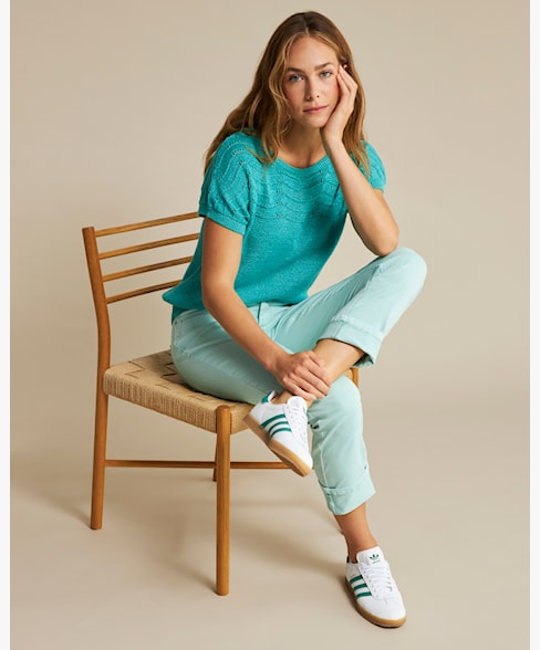 De Jerry Top is een gebreide top met korte mouwen en een ronde hals. De top heeft een geribde boord bij de hals, mouwen en aan de onderkant. De Jerry Top is gemaakt van een zachte, soepele kwaliteit en is verkrijgbaar in de kleuren offwhite, pearl, aqua, faded blue & lemon.